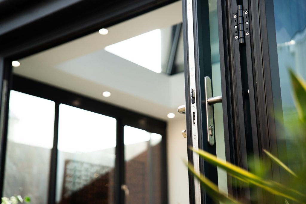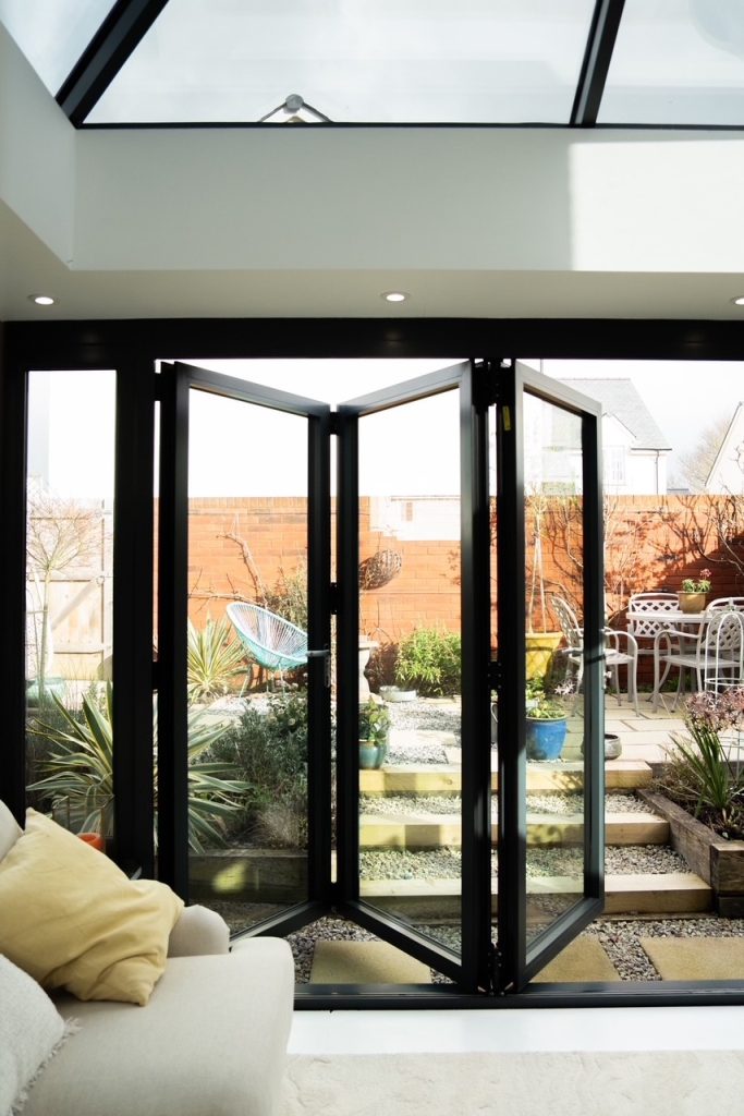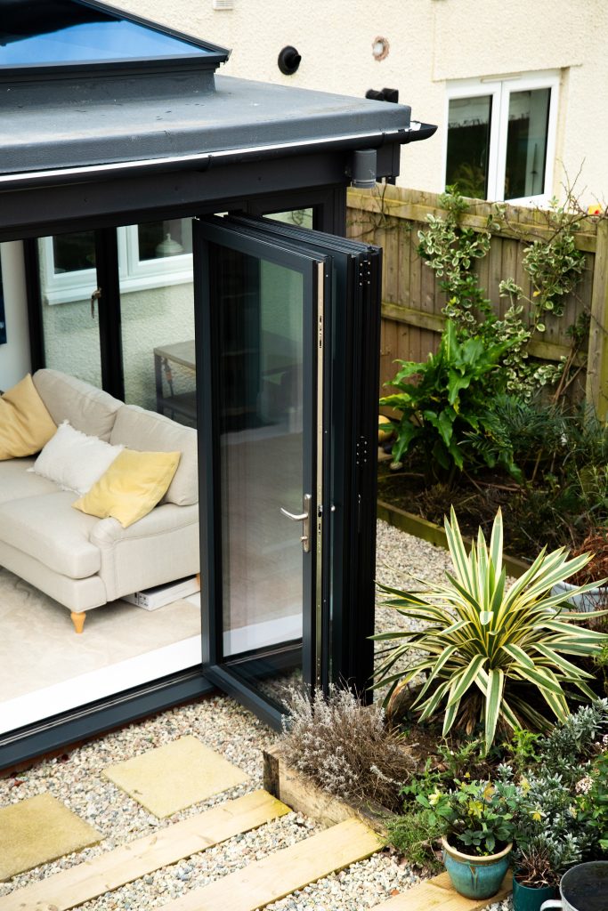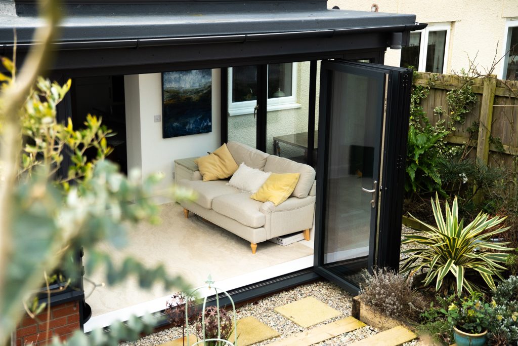 Framing the garden beautifully are sleek aluminium bi-folding doors. Their slim sightlines maximise glass area, inviting uninterrupted views and seamless access to outdoor spaces. When fully opened, they dissolve the boundary between inside and out — perfect for entertaining or simply enjoying warmer days with fresh air flowing through the home. Aluminium’s strength and durability also ensure long-lasting performance with minimal maintenance.